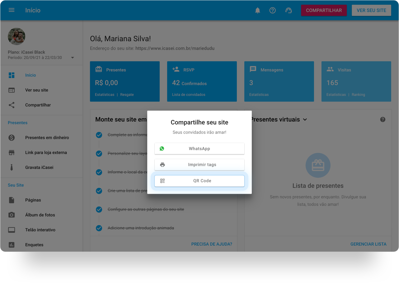 Com o site de casamento pronto, chegou o momento de compartilhar o link com os convidados. Por isso, além de compartilhar pelo WhatsApp, convite digital e nos stories do Instagram, no iCasei também é possível gerar um QR Code direto no painel de controle.